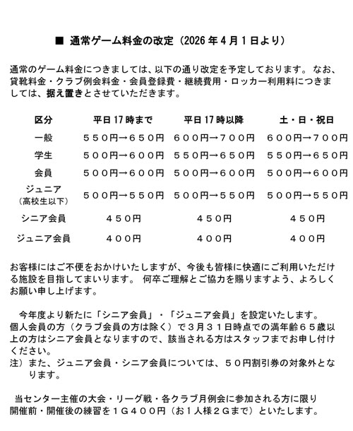 アベレージ表はフロント横掲示板に都度掲載いたします。
